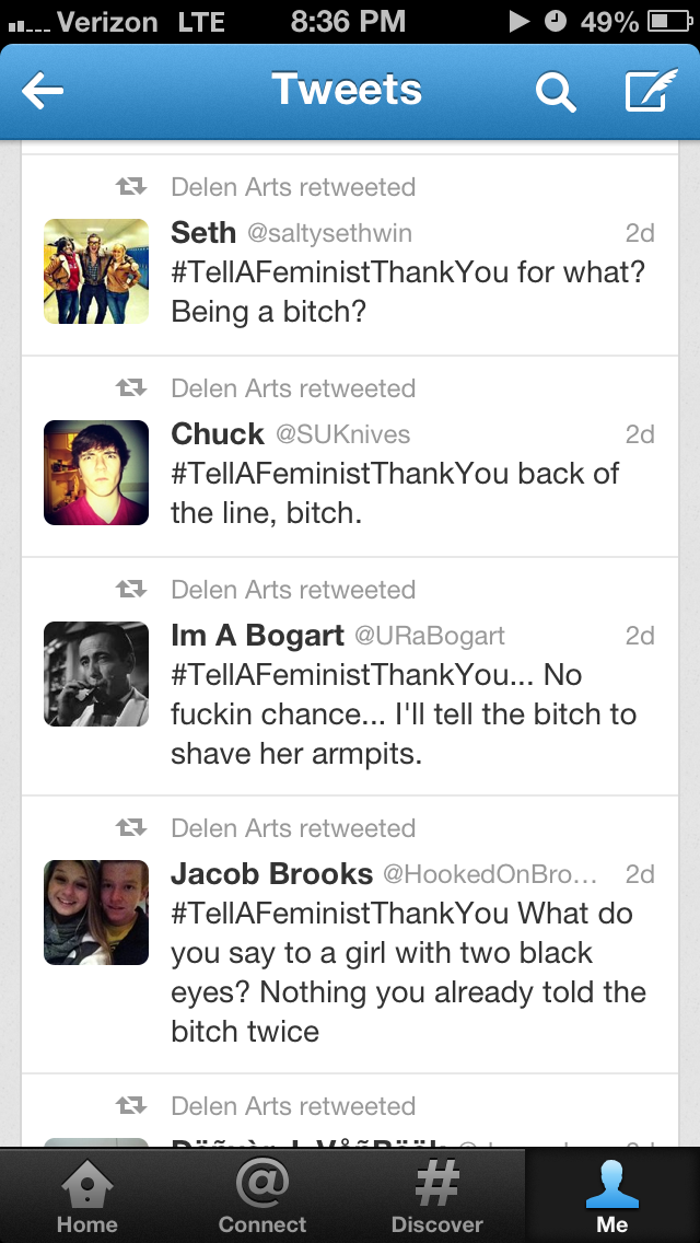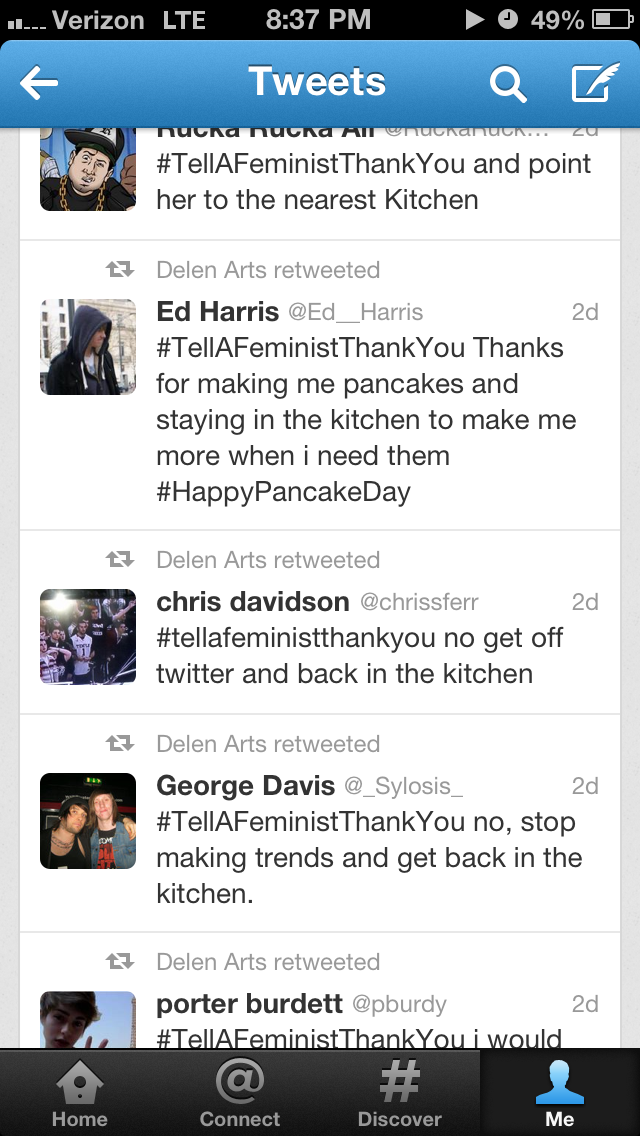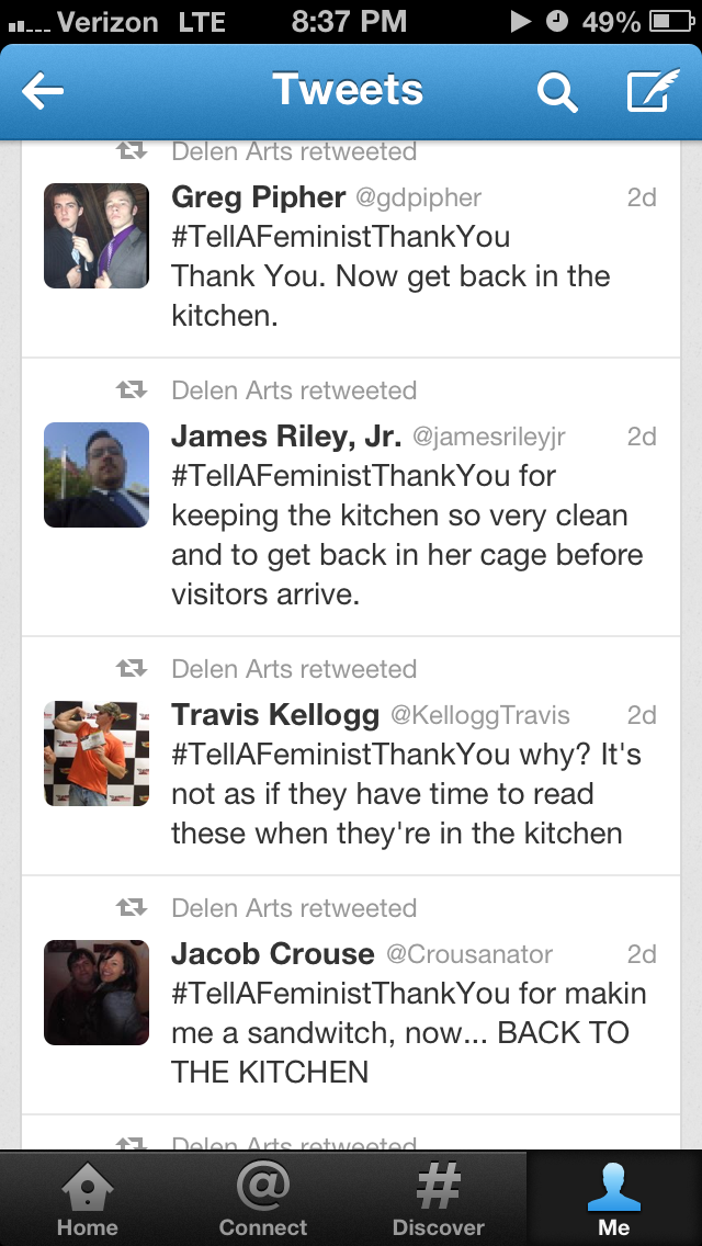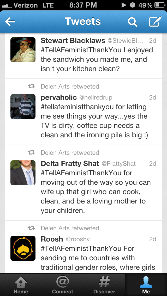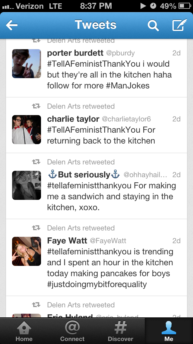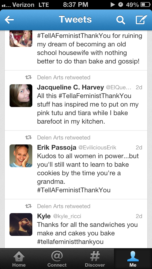 I saved some of my searches for “#tellafeministthankyou” on Twitter when it trended this past week. The screenshots below display some of what I found.
