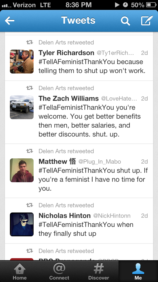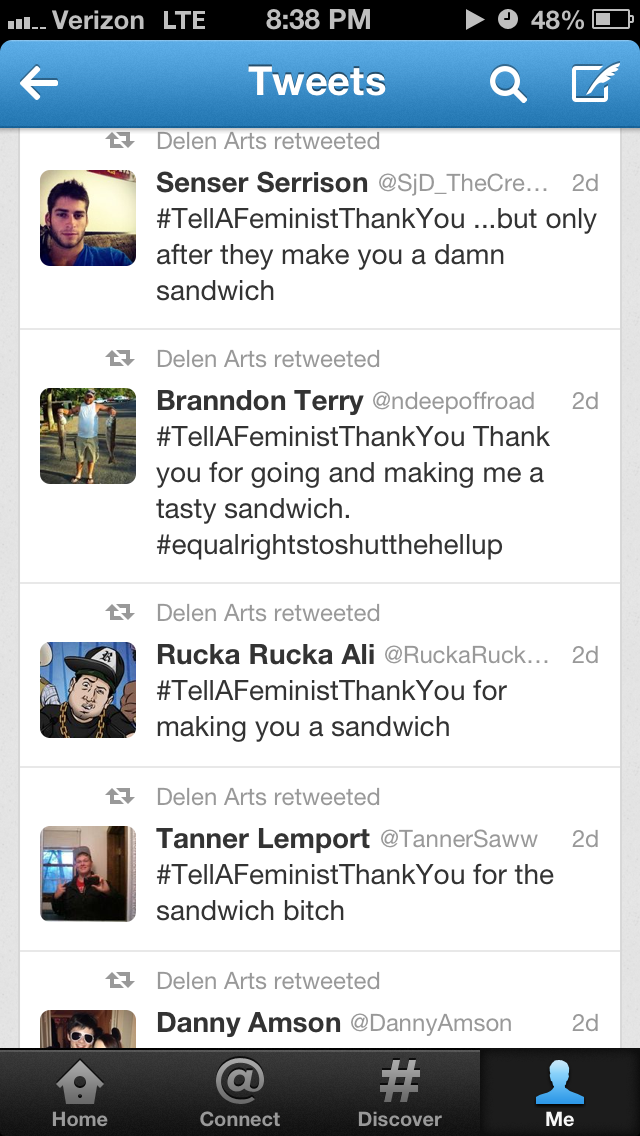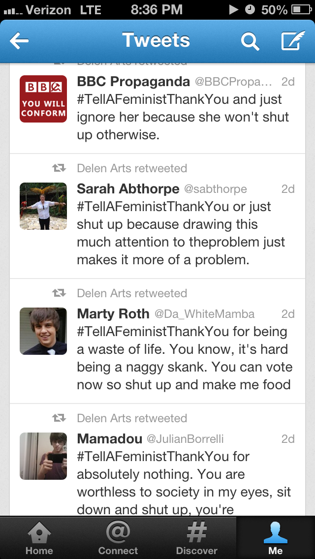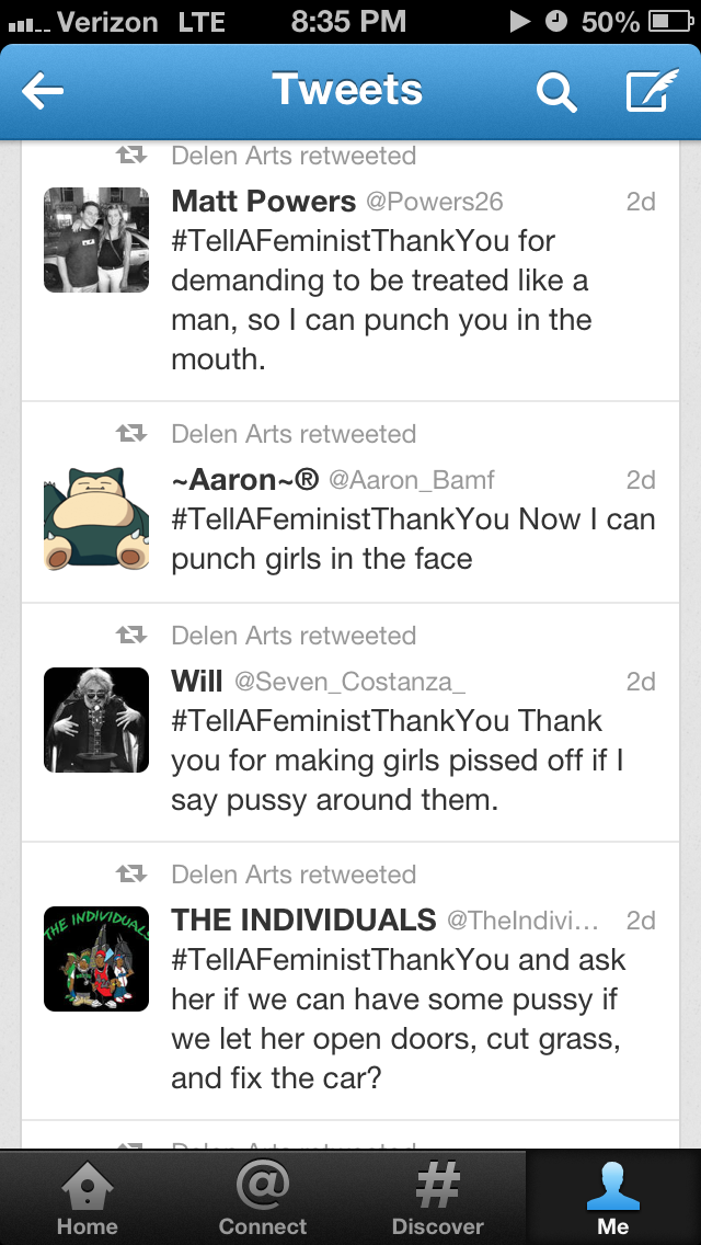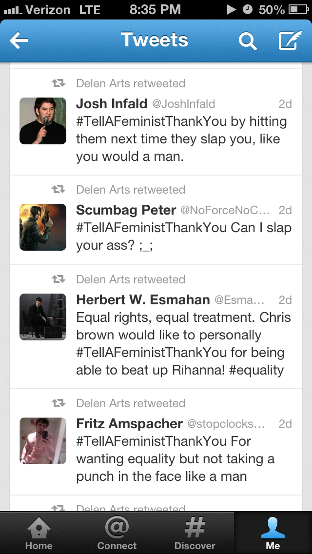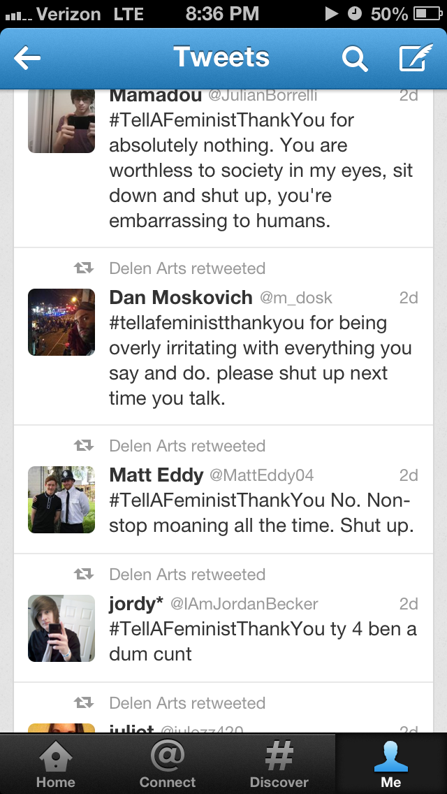 I saved some of my searches for “#tellafeministthankyou” on Twitter when it trended this past week. The screenshots below display some of what I found.